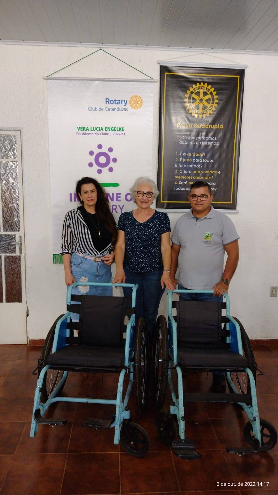 A cadeira de rodas proporciona ao indivíduo impossibilitado de locomoção a mobilidade, consequente inclusão social e melhor qualidade de vida. Ciente disso e, também, da utilidade e importância da cadeira de rodas para a área de saúde, o Rotary Club de Catanduvas doou duas cadeiras de rodas à Prefeitura Municipal de Três Barras do Paraná no dia 03 de outubro de 2022.